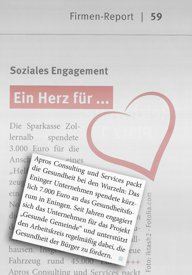 Des Eninger Unternehmens APROS Consulting und Services an das Gesundheitsforum Eningen. Damit auch in Zukunft viele interessante Projekte und Veranstaltungen rund um das Thema Gesundheit moeglich sind. Veroeffentlichung Magazin Wirtschaft Neckar Alb