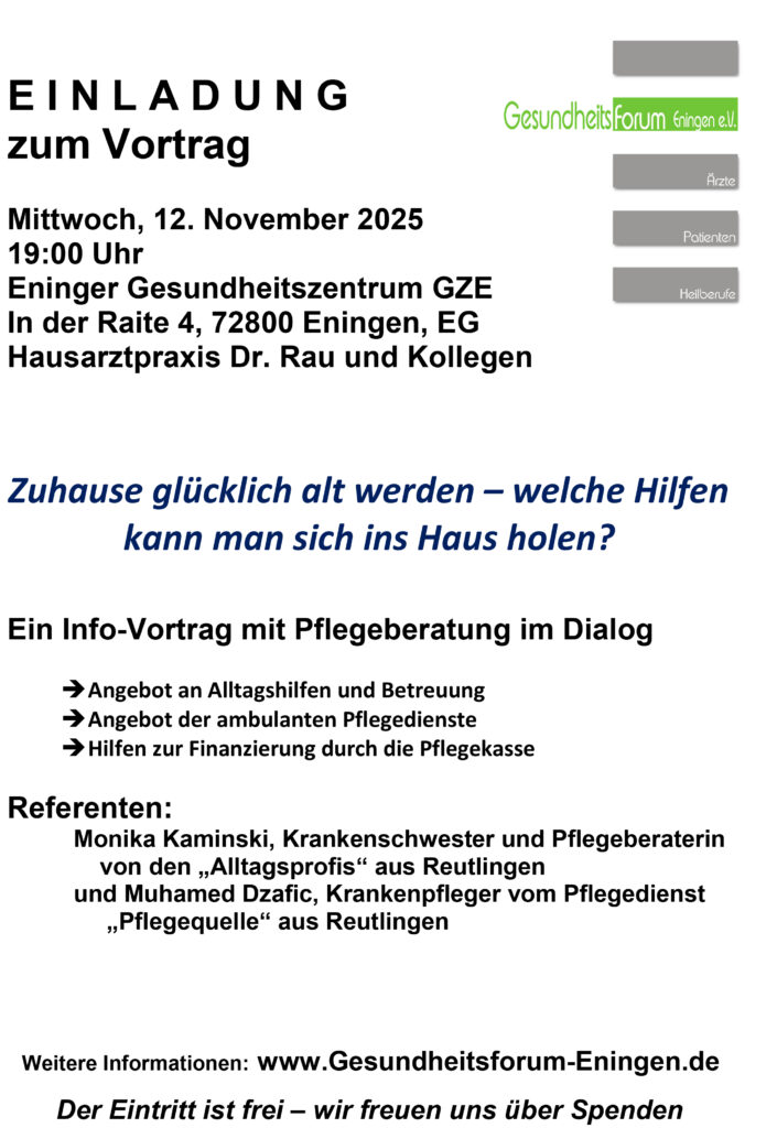 Alle interessierten BürgerInnen sind am 12. November 2025 um 19:00 Uhr herzlich zum geplanten Infovortrag im Gesundheitszentrum Eningen, In der Raite 4 in Eningen eingeladen!